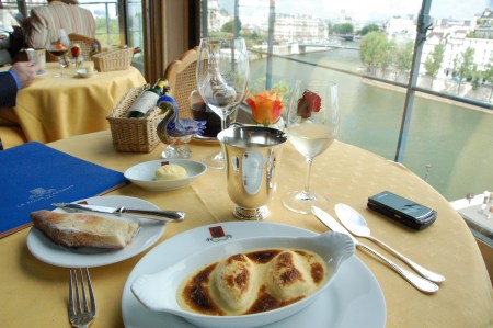 When I arrived at the appointed hour of 1230h, I found the general manager, another staff member and a page boy waiting at the front entrance. The ground floor is basically a museum, decorated in late 18th century décor, the way it was. Photographs and autographs of luminaries who had dined there lined one of the walls. The page boy, who ushered me to the elevator and operated it as well, was dressed in period costume. When I reached the 6th floor, all the wait staff, dressed in coat-tails, greeted me in French. Very formal. I was the first one there, and was ushered to a window seat, overlooking the Notre-Dame. This is the prime seat! Very soon after, the restaurant filled up, and a few Americans came as well but, thankfully, they were not loud. The entire décor in the restaurant was 18th century period European.