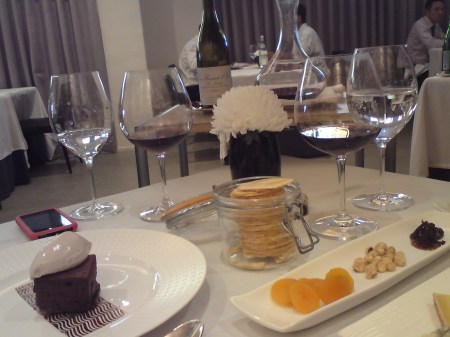 2005 Winemakers’ Collection Cuvee No.1, over a minuscule beef tenderloin at Otto. This is the sixth tasting of this wine, and the best so far, since I took delivery of 2 cases in 2008. It has developed beautifully, the color now a more luminous ruby red, clear yet deep, from which arose flavours of both dark and red fruits coated with glycerin, fairly intense and rich, nicely ripe without being over-extracted. The entry is soft but, revealing notes of chocolate and raisins, excellent presence and receding tannins that led to a moderately long finish without any sign of the fruit drying out, nor the austere greeness that marked the first few bottles last year. This is coming together very well, much more cohesive and seamless, on the verge of developing its secondary flavours. This project to allow a celebrated winemaker each year carte blanche to grow and make wine from a parcel of Ch D’Arsac had initially seemed gimmickry, especially as the bottling and labeling (completely in English) appear very un-Bordeaux, with a clear commercial slant. The vineyard, one of the first to be encountered south of the Margaux commune as one drives up north into the Medoc, certainly didn’t appeal to me at all when I passed it several times, lying on the “wrong” side of the D2 highway and appearing unkempt. It’s amazing what Michel Rolland has achieved for the inaugural vintage, no doubt assisted by the perfect weather in 2005. I shall have to carefully space out the remaining half-dozen lying in my office, and keep that un-opened case in cold storage even longer. Excellent.