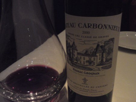 2000 Ch Carbonnieux rouge, all to myself at Moomba (well not really…a couple of generous pours going to Jeremy and Leonard, the chef). This is, by far, the best showing of this wine after having tasted it on 3 different occasions over the past year. The nose was quite forward right from the first pour, offering loads of cool ripe black berries intermixed with some soy and earthy tones, fairly deep and inviting. The entry was soft, the wine medium-full with a bit of hollowness on the mid-palate initially, finishing with some unresolved tannins. Things changed by the second glass, however, the wine becoming more open, gaining greater weight and intensity, the hollowness replaced by a fresh layer of richness and depth hitherto not encountered, leading to more sophisticated tannins at the finish. On the verge of developing secondary characteristics. Very good. At SGD88, it’s worth getting more should you chance upon it at Carrefour.
