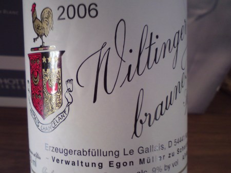 2006 Egon Muller Wiltinger Braune Kupp Riesling Spatlese (difficult-to-find; purchased from Vinum’s warehouse sale), at the Reunion Dinner on 13 Feb 2010 over steamboat delicacies. Beautiful clear yellow. An abundance of nectarine and apricot on the nose, highly perfumed, living up to its promise with a generous expression of tropical fruits, immediately leading to a deeper vein of exotic flavours that danced persistently across the palate, vibrant and vivacious without the acidity being overly crisp. Simply quite sublime.