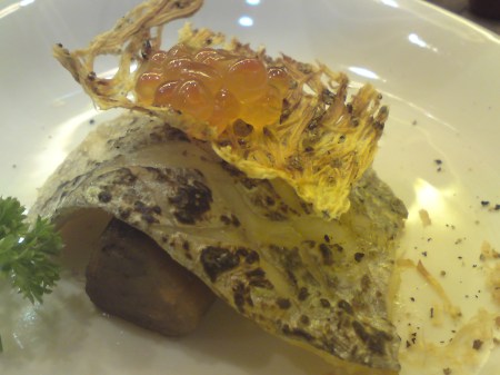 Thrown into the fray was a 2006 De Loach pinot noir from Sonoma Coast, displaying a pure pinot tint with a lovely bouquet of rose-scented red fruits, medium-full, broad with very good levels of fruit concentration, suitably intense and rich on the mid-palate, tapering to a gentle finish, developing a sacharine coat after some time. Excellent, just lacking in the minerality of Old World burgundy that’s critical to the expression of terroir. The 2004 Bottega Brunello di Montalcino that followed (courtesy of Jeremy) was bright cherry red with a restrained nose; I could just barely make out some sweet vanilla and preserved fruit. On the palate, the sangiovese fruit was not as intense nor plummy as I’d imagine a young Brunello to be, possessing instead a lovely softness and elegance, showing excellent delineation, leading to a sweet persistent finish. Excellent.