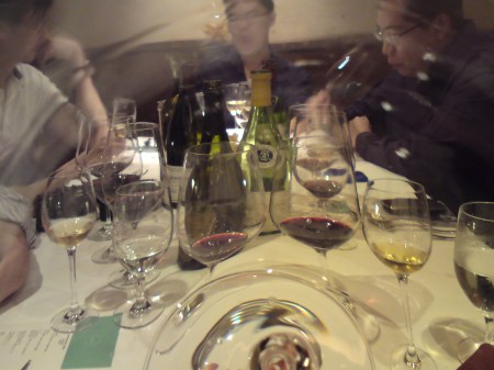 The final red, showing a deep dense inky purple, was still rather muted in spite of all that decanting and airing, revealing only a glimpse of blackberries with emerging sweet oak. A huge wine of immense concentration, yet quite soft, not the monolithic sort of monster that knocks your palate out. Almost hedonistic but in a tightly controlled manner, medium-full with notes of plum and glycerin, finishing with a bit of menthol. Doesn’t strike one as outright New World in style. Most concluded a Californian cult wine…Araujo? Heitz Martha’s Vineyard? It took everyone by surprise when it was revealed to be a 2003 Pingus, the actual thing.