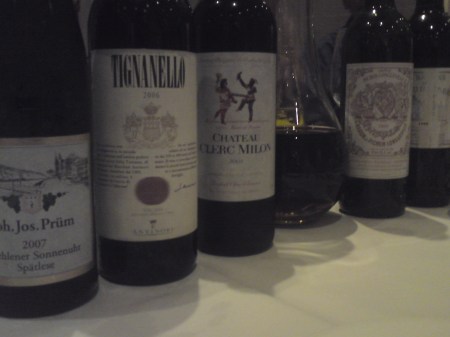 We kicked off the reds with a 2006 Tignanello (courtesy of Gerard), typically a blend of around 80% sangiovese and 20% cabernet sauvignon. Deep purple. A complex bouquet of sweet cassis and a bit of plum, medium-bodied, developing sexy velvety tannins with time with very attractive biting intensity, the cabernet fruit providing an excellent stern structure with a minty after-glow and finish. Excellent.