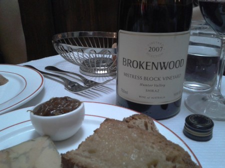 2007 Brokenwood Mistress Block shiraz, at L’Entrecote on 27 Sep 2011. Popped and poured. This is a single vineyard shiraz that demonstrates the qualities of Hunter Valley shiraz – there’s plenty of primary flavours from the generous fruit, lots of raspberries and red fruits, and less of the typical flood of warmth and licorice and plumminess that one associates with Aussie shiraz, bold but very finely balanced with understated tannins, leaving your palate unscathed. Just a notch below the estate’s famous Graveyard shiraz, but it’s very good.