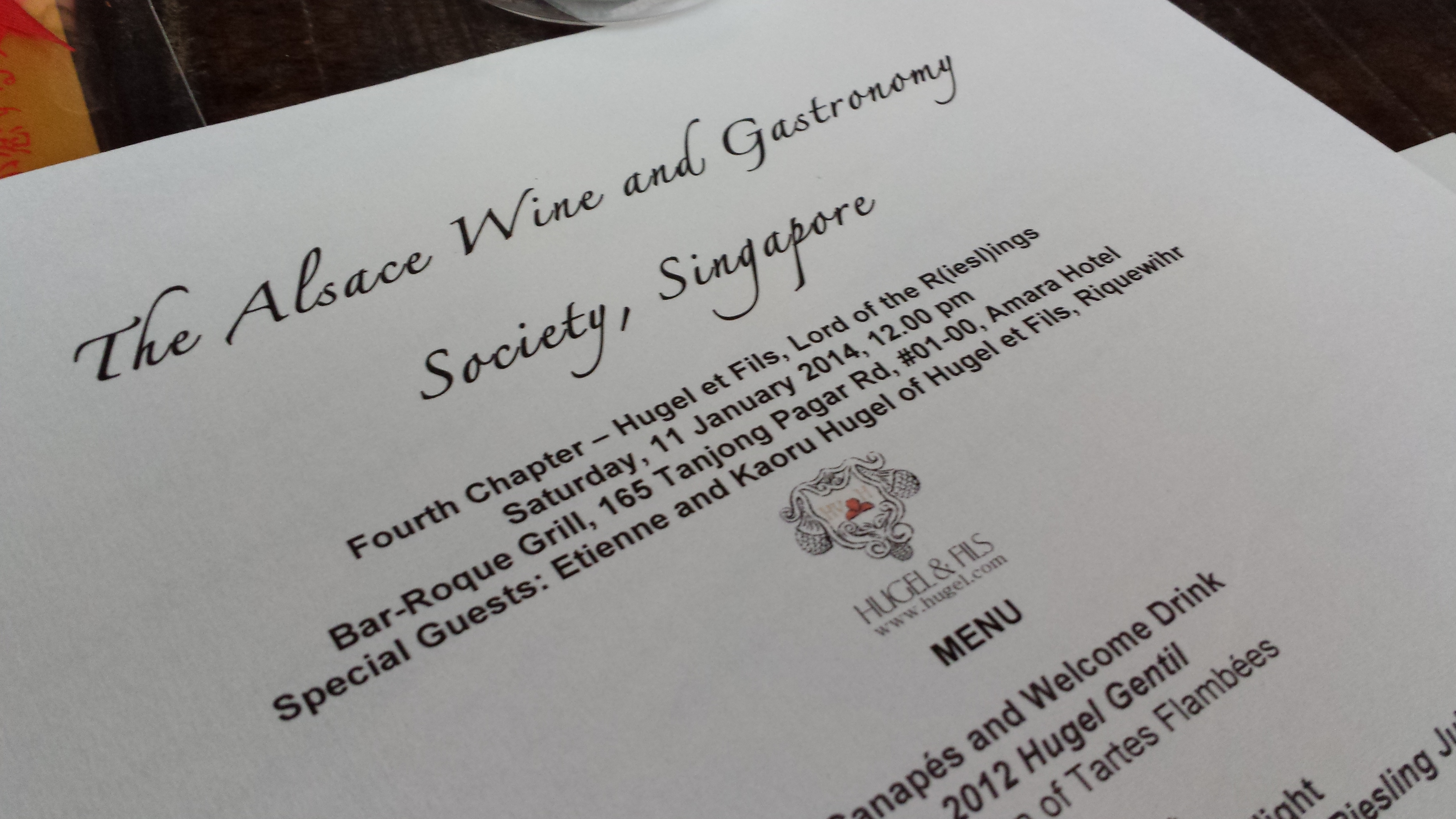 I had the opportunity to attend a lunch organised by the Alsace Wine & Gastronomy Society, courtesy of its founder Julian Teoh, on 11 Jan 2014 at Bar-Rouge, Amara Hotel, Singapore, featuring the wines of the famous Alsace producer and negociant Hugel et Fils with its proprietor Etienne Hugel, and his lovely Japanese wife, in attendance.