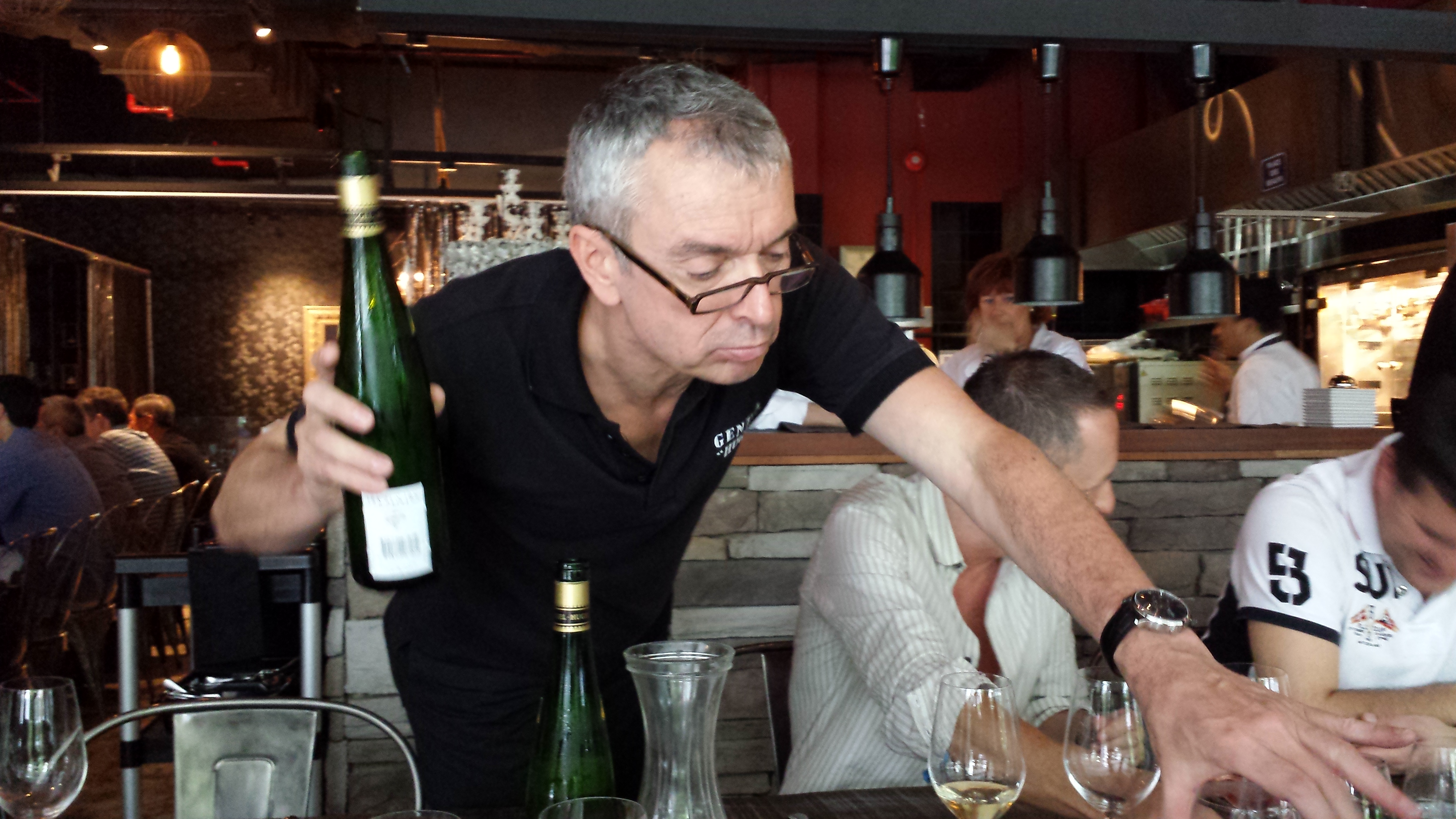 Once we were seated, Etienne poured an unusual entity in the line-up, a 2008 Hugel Pinot Noir Jubilee that was quite correct in color but otherwise nondescript, with just faint notes of red cherries that was really unremarkable. Stick with real Burgundy.