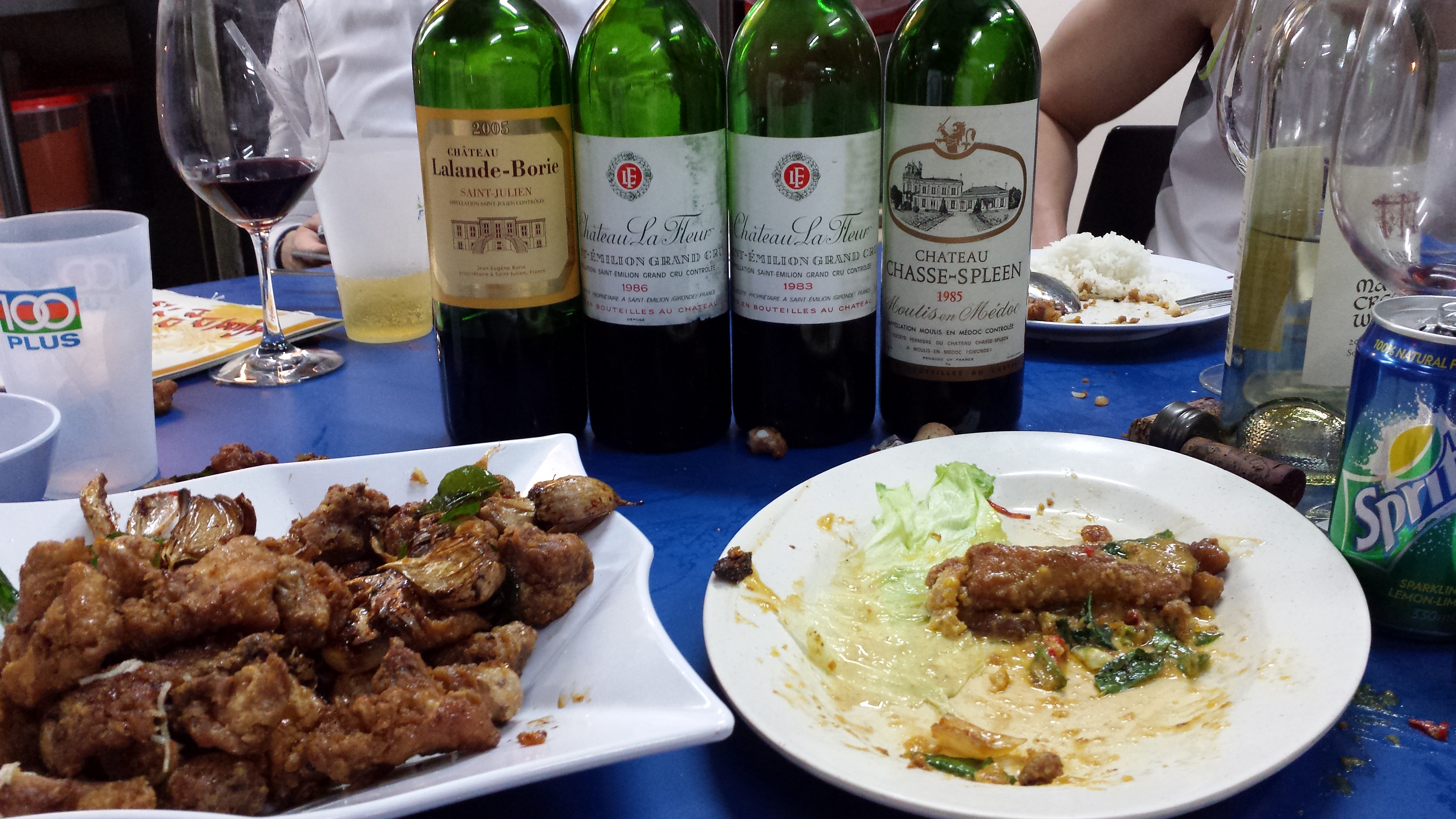 1983 Ch La Fleur (courtesy Hiok), popped and popped at Top Seafood, 26 Mar 2014. Not to be confused with Lafleur of Pomerol. Uneven at first, the wine fading at the sides while struggling to maintain its core of fruit that is clearly past its peak, lowish in acidity with herbal notes and tertiary characters of old leather, cinnamon and a dash of apricot. It firmed up after some time and held course for the rest of dinner, but the 1986 below is far preferable.