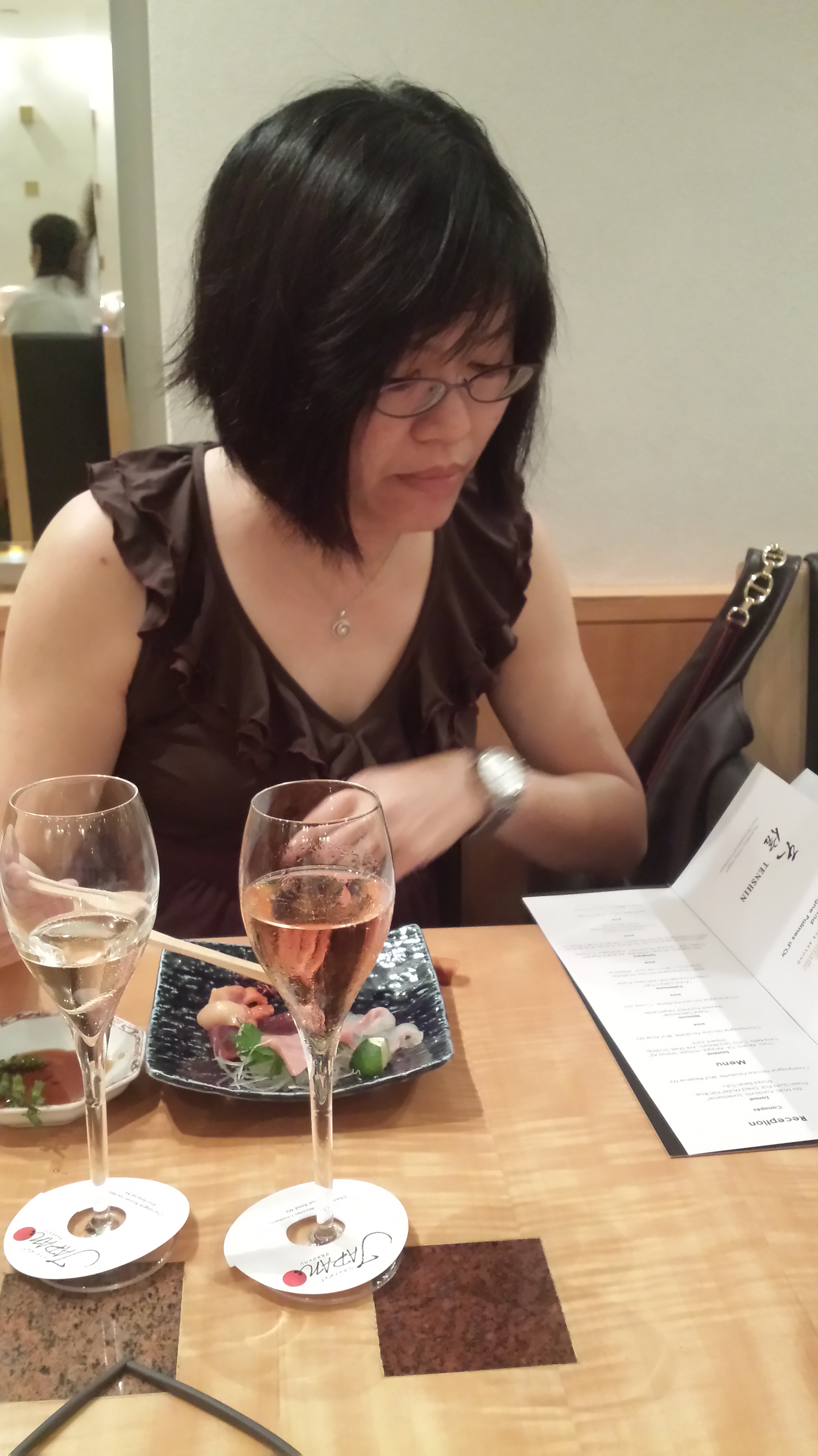 These are notes from an evening when we were invited by Dr KW Wang to dinner at Tenshin, a Japanese restaurant specialising strictly in tempura only at the Regent Hotel, Singapore, 8 May 2014, themed with the champagne of Nicolas Feuillatte, the well-known maison based in Epernay.  20140508_202557[1]To get the evening rolling, the Nicolas Feuillatte Brut Reserve NV was served as the aperitif, displaying complex flavours of citrus, lime and grapefruit amidst a generous body of light toast with excellent depth of fruit, smooth, lively and refreshing with just a tad of sweetness by the side. This was followed quickly by the Nicolas Feuillatte Brut Rose NV. Having had more experience with champagne over the years, I no longer quite fancy rose nowadays, tending to find them a bit too straightforward and lacking in real character. This turned out to be the case here, the wine exhibiting notes of cider, tangerine and a hint of red fruits, slightly dry but ultimately lacking in true complexity even though the wine attained greater depth and expanse over time with further notes of pomelo and bitter lemon.