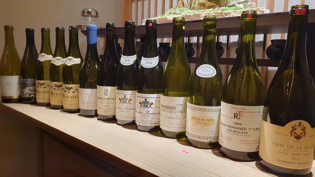 Coche-Dury Meursault 2008 2014 2016, Leflaive Chevalier-Montrachet 2004 2006, 2010 Comtes Lafon Meursault-Goutte d’Or, 2016 Arnaud Ente Meursault Clos Ambres, 1999 René Engel Vosne-Romanée Brulées, 1996 d’Auvenay Chevalier-Montrachet & 2004 J-F Mugnier Musigny Grand Cru