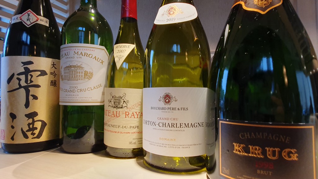 2019 Bouchard Corton-Charlemagne GC, 2000 Château Margaux, 2007 Château Rayas 1998 Champagne Krug Brut
