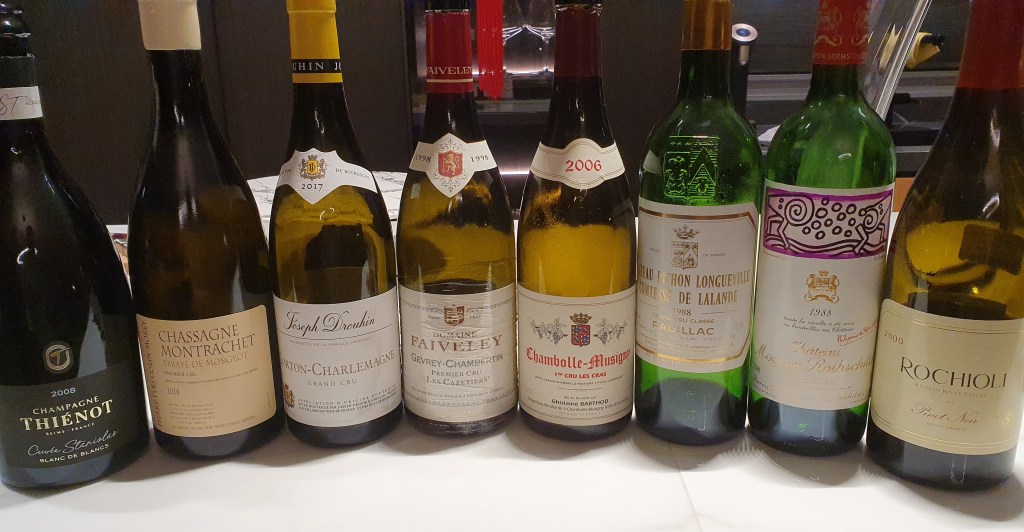 2017 Joseph Drouhin Corton-Charlemagne 2018 PYCM Chassagne Abbaye de Morgeot 2006 Ghislaine Barthod Chambolle Les Cras 1998 Faiveley Gevrey-Chambertin Cazetiers 1988 Pichon Longueville Comtesse Lalande 1988 Mouton Rothschild, 2000 Rochioli