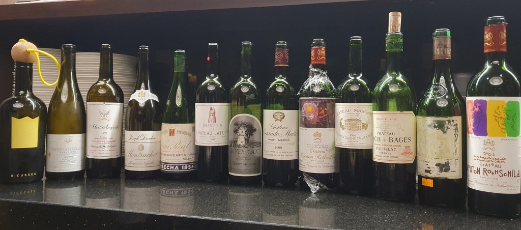 2000 Henri Boillot Corton-Charlemagne, 1990 Sociando-Mallet, 1982 Haut-Brion, 1996 Margaux, 2004 Latour, 1970 Lynch-Bages, Mouton Rothschild 2001 & 1998, 1986 Silver Oak Bonny’s Vineyard
