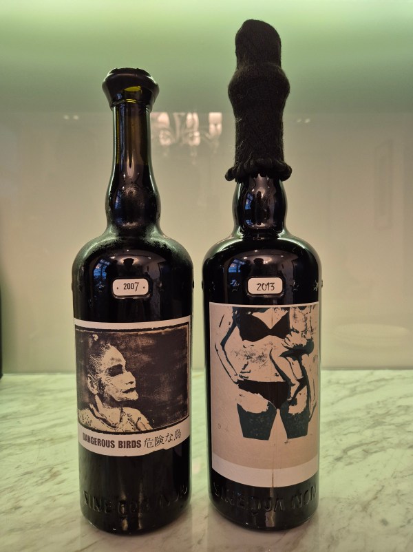 2007 Sine Qua Non Dangerous Birds, courtesy of LF at Kai Garden, 04 Sep 2025. Impenetrable deep garnet, opening with a pebbly warmth that led to a sharp attack and rasping intensity on the medium-full palate, replete with overtones of tobacco snuff. Modest finish. Made of 100% syrah.